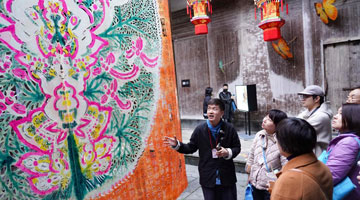西汉彩绘人物车马镜局部彩绘图案“谒见”(8月25日摄)。