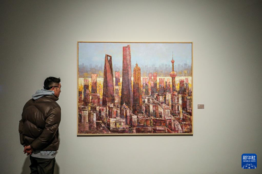 1月12日,观众在观赏画作《上海长高了》。