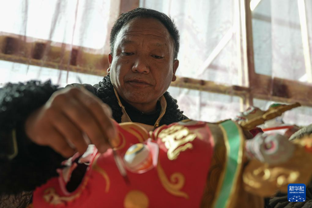 12月9日,西洛在合作社展览厅查看和同事们一起制作的西藏传统面具。