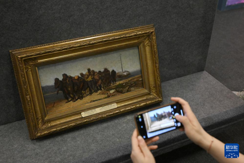 7月16日,工作人员查验列宾画作《伏尔加河上的纤夫》油画草图。