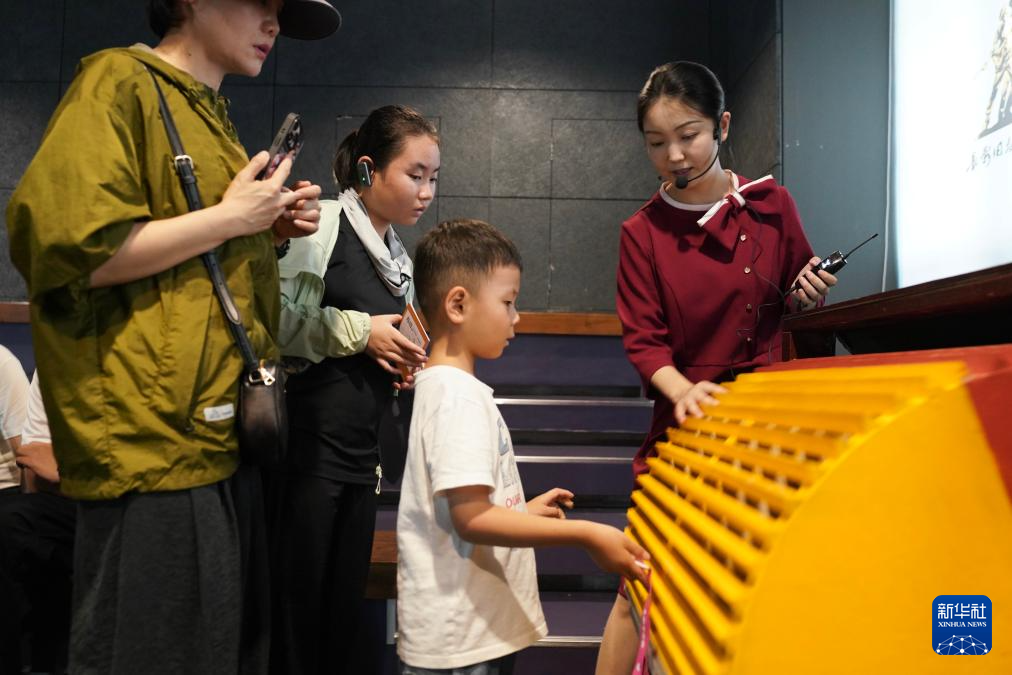 8月7日,小朋友在长影旧址博物馆拟音互动室参观体验。