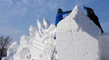 1月13日在哈尔滨冰雪大世界园区拍摄的冰雕作品《平衡之旅的缓慢进程》。