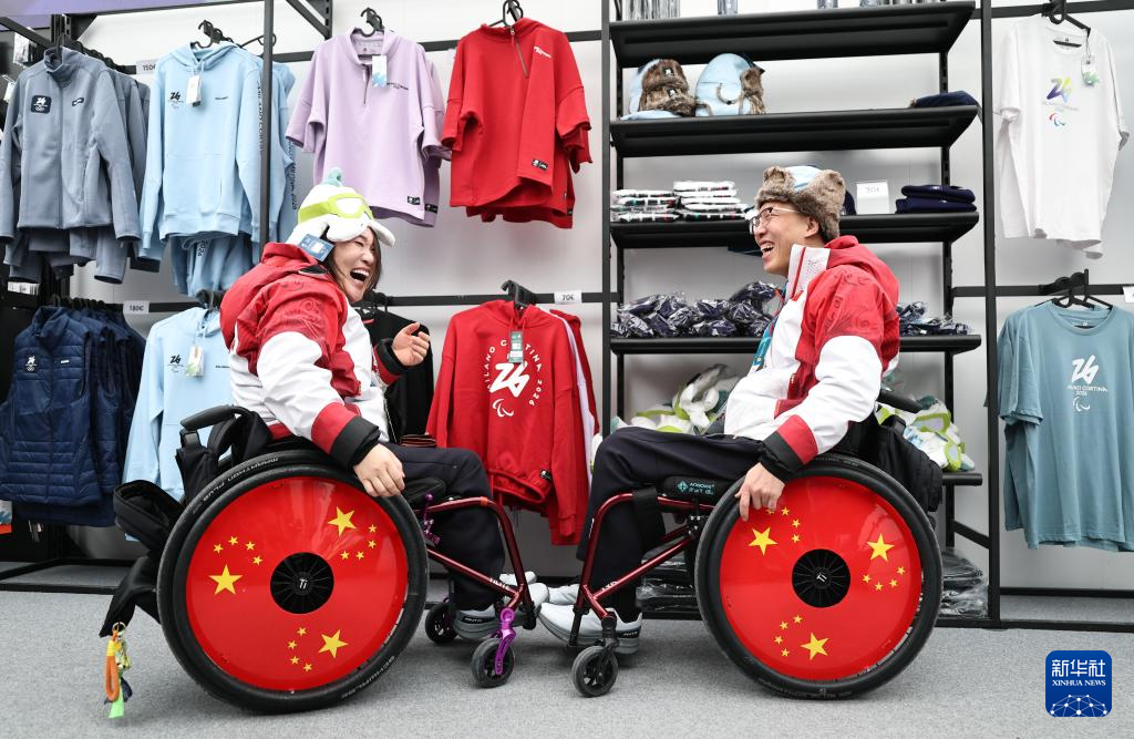 3月3日,中国残奥冰壶队选手陈建新(右)与队友李娜娜在残奥村内的纪念品商店选购。
