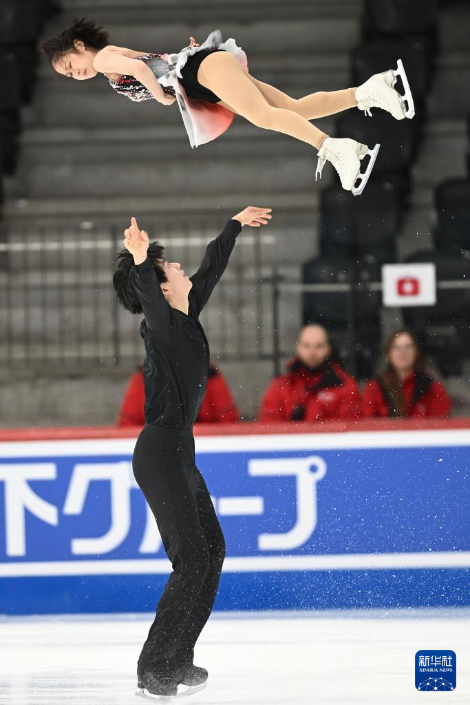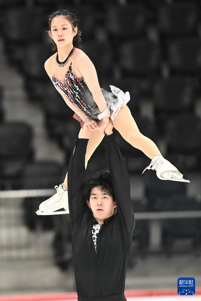 3月4日, 中国组合陈雨萱(上)/董胤博在双人滑短节目比赛中。最终,他们暂列第六名。