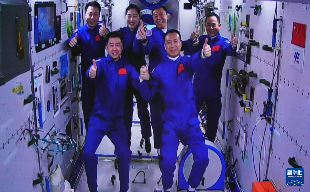 2022年11月30日在酒泉卫星发射中心拍摄的神舟十五号航天员乘组与神舟十四号航天员乘组太空合影的画面。