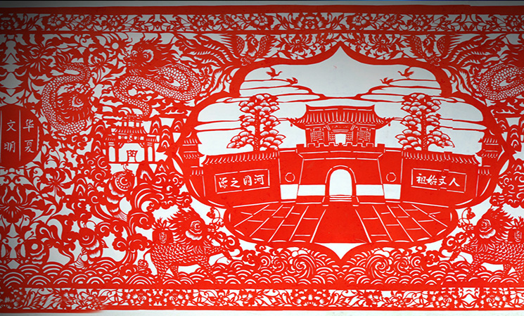 于是我決定回家專門剪紙,但是我父母認為鉸花都是老婆婆們閑著沒事做的事,你一個男孩子還是應該好好賺錢。就這樣我跟父母僵持了很久,但最后還是我拗著性子從外邊回到了我們農(nóng)村老家,開始尋找會剪紙的老人,去記錄、去詢問、學習我們地區(qū)傳統(tǒng)的剪紙民俗知識。因為現(xiàn)在像剪紙這個藝術(shù),在我們的地區(qū)還僅是一些老人出自一些喜好去剪、去做,但隨著這些老人的去世,這些作品也就會隨著一把火被燒掉。我希望我能把這些東西都保留下來,我希望有更多的人去了解我們地區(qū)的剪紙文化,所以我就下決心收集這些剪紙的資料,去申報非物質(zhì)文化遺產(chǎn)名錄。想要申報還要去做很多的事情,一是去尋找這些傳世的老作品,另外就是要擴大孟津剪紙的影響力,參加各種比賽去獲獎。那時我白天去尋找老藝人,晚上就自己在屋里埋頭創(chuàng)作,每天晚上都會剪到凌晨一點多。我媽本來是反對的,但是當她看到每晚我都會剪到很晚,她就明白了我是真心喜歡這個事兒,就慢慢地開始心疼我。后來她也幫助我開始粘貼,像我剪的《都說我孟津好風光》,這個作品長13米,沒有那么長的紙,我們就一起粘貼。花了三個多月剪完,家里邊沒有那么大粘貼裝裱的空間,我父母就站在我們家院子的平房頂上一起把它鋪開,一個一個地粘起來裱好。