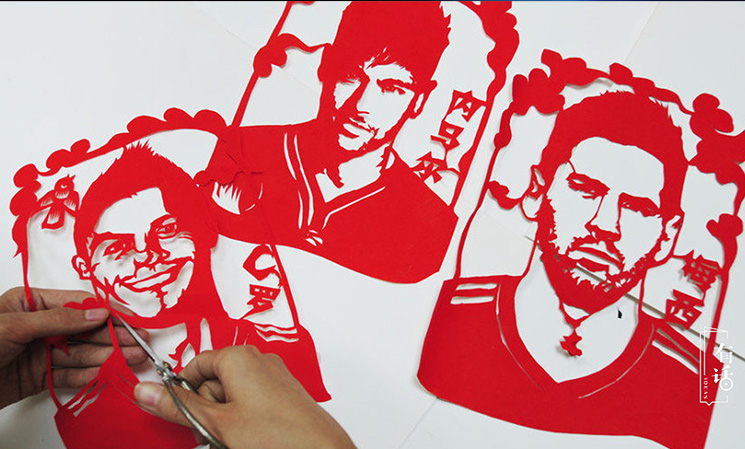 我之前剪過的民俗剪紙作品,像《白蛇傳》、《七月七鵲橋會》、《夜哭郎》等等,這些題材承載的是我們的傳統(tǒng)。但這些較為傳統(tǒng)的剪紙受眾并不多,所以我認為青年人要有新的創(chuàng)新,加入現(xiàn)代社會中許多時尚前衛(wèi)的元素,這樣才能獲得更多人的喜愛。在2014年世界杯的時候,我就試著剪“世界杯剪紙”,梅西、C羅、內(nèi)馬爾,讓一些球星躍然紙上,讓熱愛足球的年輕人去關注、了解到傳統(tǒng)的剪紙藝術(shù)。2015年是世界反法西斯戰(zhàn)爭勝利70周年,我看到關于戰(zhàn)爭的一些資料圖片后,就創(chuàng)作了一幅《南京大屠殺》剪紙。畫面中運用了黃色、紅色、黑色表現(xiàn)土地、火焰還有憤怒,這些都是用剪紙來表達我心中的感受。我的工作室現(xiàn)在也會做一些時尚的婚紗照剪紙,還有生日剪紙等,把這些傳統(tǒng)吉祥的寓意融入到現(xiàn)代人們的需求、裝飾和禮物中。