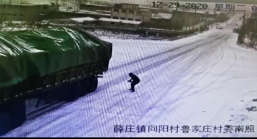 2020年12月29日,山東臨沂出現(xiàn)大雪降溫天氣,江蘇徐州一貨車在經(jīng)過費縣時,因積雪上坡道路結冰,司機緊急制動于事無補,車輛不斷下溜。