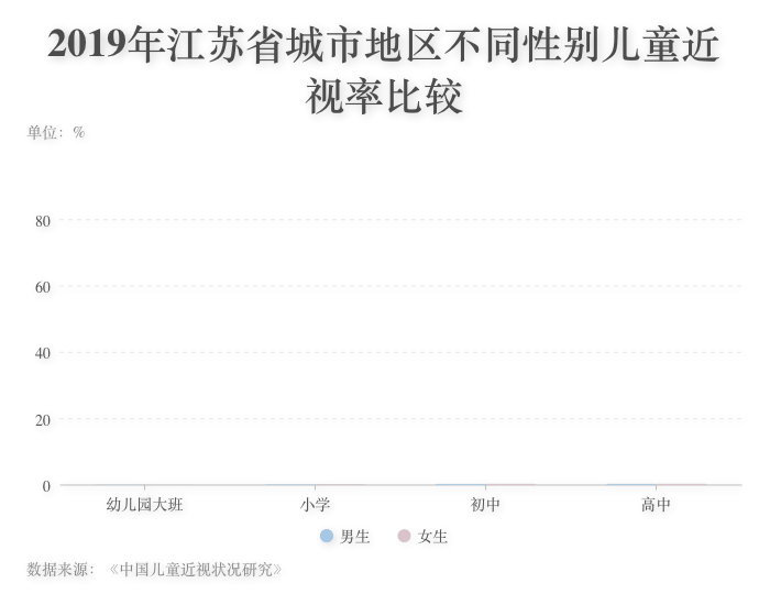 ????? 中國兒童近視率隨年齡的增長呈現(xiàn)上升趨勢。以江蘇省2019年的調(diào)查結(jié)果為例,該省幼兒園大班兒童近視率為12.8%,小學(xué)階段增長至38.5%,初中階段增長至80.2%,顯示出近視率在小學(xué)和初中階段增長速度較快,說明低年齡階段是近視防控的重點階段。