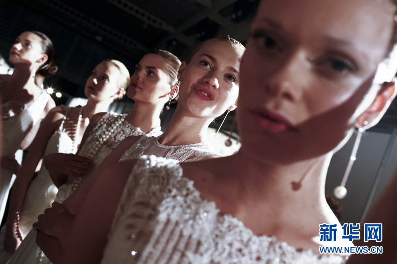 場外正在準備登臺展示婚紗的模特。