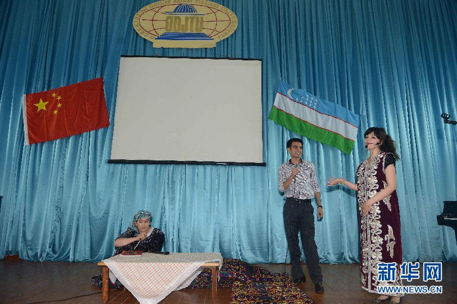 6月9日,學生代表在烏茲別克斯坦首都塔什干的烏世界語言大學禮堂表演節(jié)目。