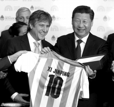 ????在和阿根廷副總統(tǒng)兼參議長布杜及眾議長多明格斯舉行會談時,習(xí)近平特別提到阿根廷足球隊在世界杯奪得亞軍,他說:“剛才眾議長先生問我是否喜歡足球,我說我非常喜歡足球。他也祝愿中國能夠早日舉辦一屆世界杯,這正是我的愿望。但是我們足球的發(fā)展,還希望同阿根廷加強交流合作,靠你們的幫助,提高我們的水平?!?/p>