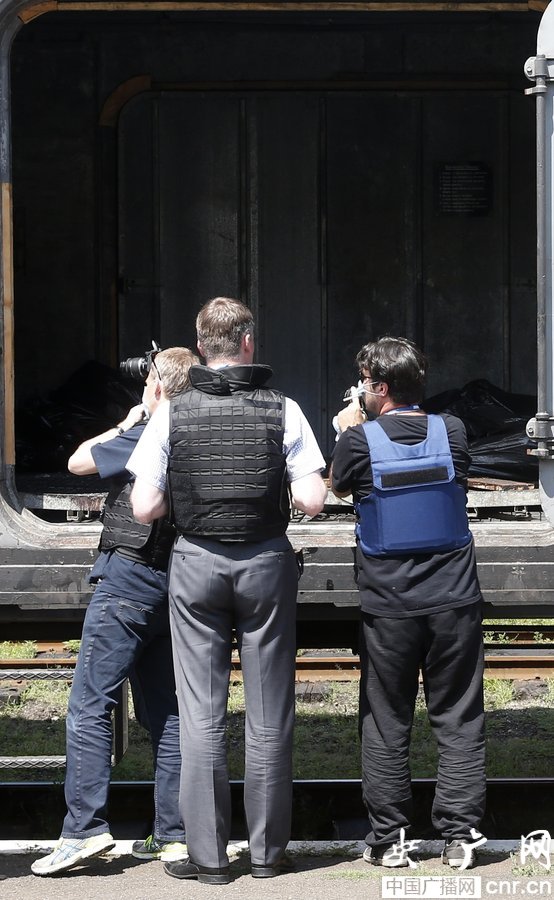 當(dāng)?shù)貢r間2014年7月20日,烏克蘭頓涅茨克Torez,馬航墜機(jī)遇難乘客遺體被裝上列車?yán)洳剀噹麑⒈贿\(yùn)走。載有部分遺體的火車從距空難現(xiàn)場不遠(yuǎn)的烏克蘭托列茲市出發(fā),前往頓涅茨克市。火車離站前,身處空難現(xiàn)場的歐洲安全與合作組織(歐安組織)代表檢查了運(yùn)載遺體的5節(jié)冷藏車廂。