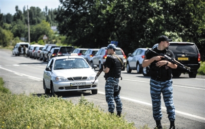 7月28日,來自澳大利亞和荷蘭的調(diào)查人員前往墜機現(xiàn)場途中,烏克蘭民間組織在其車隊后面封鎖道路。