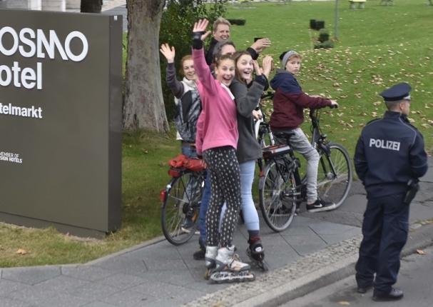 克強總理抵達(dá)后,柏林的街道兩旁,不少當(dāng)?shù)孛癖妼藦娍偫淼能囮爴]手、拍照。