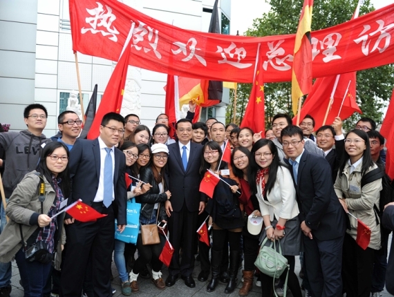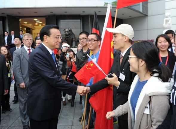 使館主樓外,還有不少中國留學(xué)生。他們打著“歡迎總理訪德”的橫幅,揮舞著中德兩國的國旗。見到克強總理走來,他們一下子圍了上去,爭相與克強總理握手。