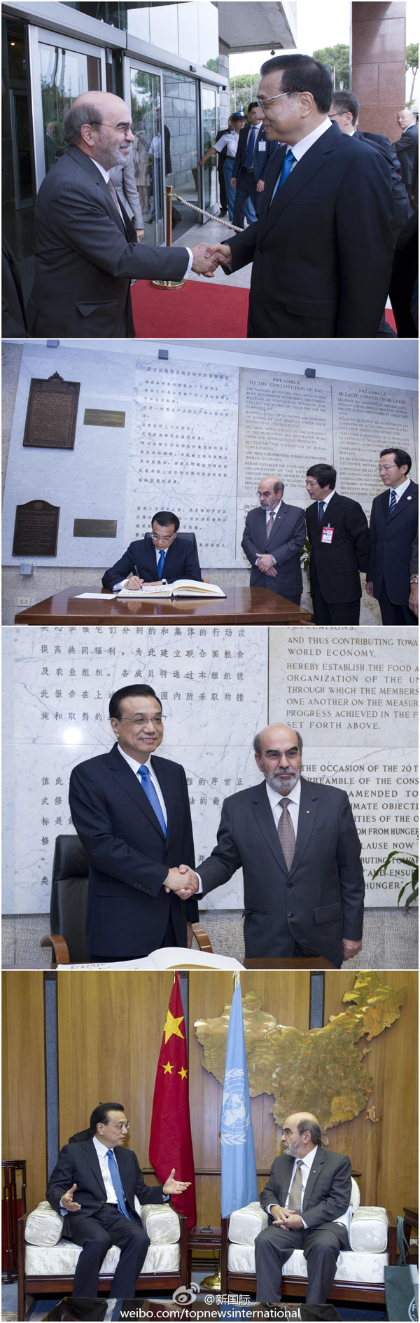 ????新華網(wǎng)北京10月15日電 據(jù)新華社“新國際”微博報道,應(yīng)聯(lián)合國糧農(nóng)組織總干事格拉齊亞諾的邀請,李克強總理在世界糧食日前夕,來到位于羅馬的糧農(nóng)組織總部訪問,與格拉齊亞諾會見并發(fā)表演講。這是李克強就任總理后首訪聯(lián)合國組織,也是中國總理首次訪問糧農(nóng)組織總部。