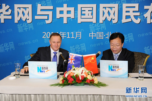 ??? 11月11日,新西蘭總理約翰·基在新華網(wǎng)與中國網(wǎng)民在線交流,回答中國網(wǎng)民的問題。圖為訪談主持人,新華網(wǎng)副總編輯劉加文代表網(wǎng)友向新西蘭總理約翰·基提問。新華網(wǎng) 陳競(jìng)超 攝