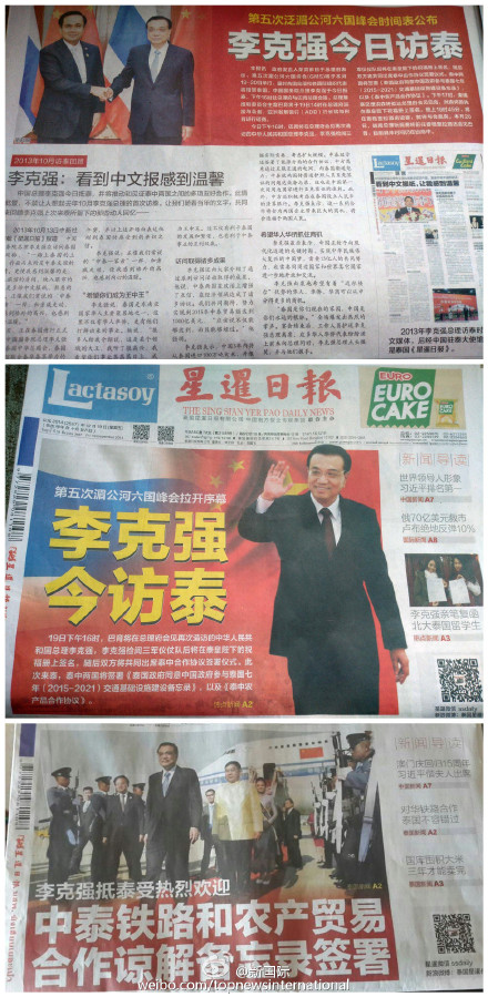 ??? 新華網(wǎng)北京12月20日電 據(jù)新華社“新國際”微博報道,泰國媒體紛紛在頭版頭條位置對李克強總理的泰國之行予以報道,社會各界高度關(guān)注。泰國《星暹日報》在頭版刊登總理大幅照片,稱總理此行將推動和見證中泰兩國之間簽署多份友好合作協(xié)議,并回顧了2013年李克強總理訪泰時的情景。