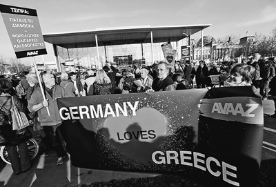 為彌合在希臘債務(wù)問題上的分歧,德國總理默克爾3月23日在柏林與到訪的希臘總理齊普拉斯會談。圖為當天在德國柏林,有示威者打出“德國愛希臘”的標語,呼吁雙方盡快達成共識。人民視覺