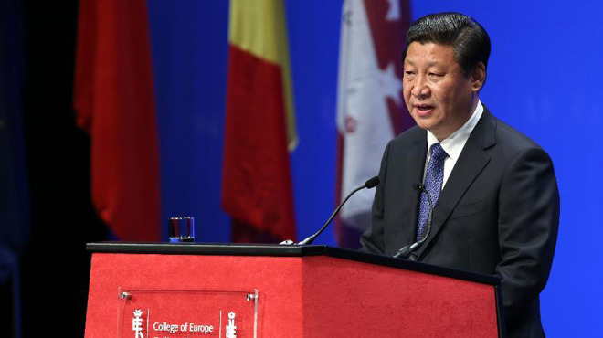 2014年4月1日,國家主席習近平在比利時布魯日歐洲學院發(fā)表重要演講。新華社記者龐興雷攝