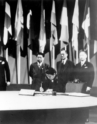 ??? 1945年10月24日,《聯(lián)合國憲章》經安全理事會的5個常任理事國以及其他簽字國過半數批準,開始正式生效。聯(lián)合國作為第二次世界大戰(zhàn)之后最大的國際性組織正式成立。此后,這一天被定為聯(lián)合國日。圖為中國代表團成員吳貽芳(前)在憲章上簽字。 新華社發(fā)