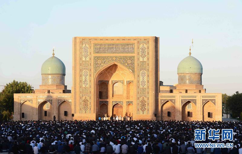 9月24日,在烏茲別克斯坦首都塔什干哈斯特·伊瑪姆建筑群清真寺廣場,人們參加古爾邦節(jié)禮拜。當天,烏茲別克斯坦各地慶祝伊斯蘭教傳統(tǒng)節(jié)日古爾邦節(jié)?!肮艩柊罟?jié)”亦稱“宰牲節(jié)”,是伊斯蘭教三大節(jié)日之一。 新華社記者沙達提 攝