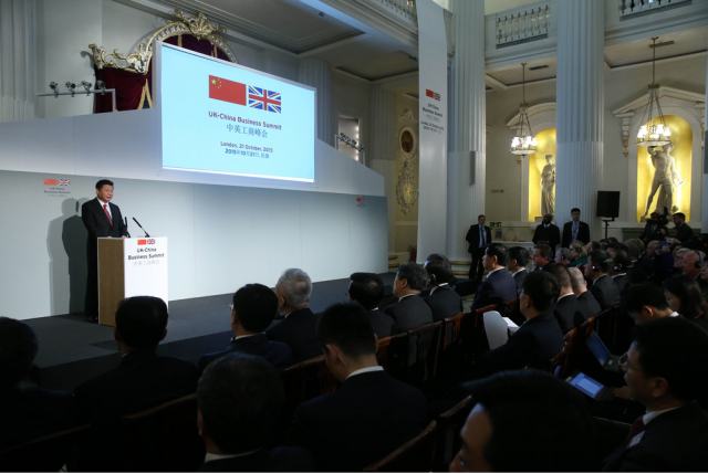 10月21日,國家主席習(xí)近平和英國首相卡梅倫共同出席在倫敦金融城舉行的中英工商峰會并致辭。(新華社記者龐興雷攝)