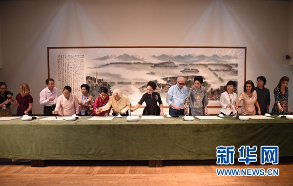 在觀看“意象中國(guó)”書(shū)畫(huà)展時(shí),彭麗媛和來(lái)賓們?cè)凇段飨o(jì)勝圖》、《朱荷圖軸》等經(jīng)典國(guó)畫(huà)作品前駐足觀看,接著欣賞4位著名書(shū)畫(huà)家現(xiàn)場(chǎng)聯(lián)袂創(chuàng)作書(shū)畫(huà)作品《江南憶》。一位書(shū)法家還為來(lái)賓們現(xiàn)場(chǎng)示范毛筆的執(zhí)筆、運(yùn)筆方式。彭麗媛邀請(qǐng)來(lái)賓們一同書(shū)寫(xiě)漢字“和”。她說(shuō),“和”字在漢語(yǔ)里具有“和平”、“和諧”之義,是我們對(duì)世界的共同心愿。來(lái)賓們饒有興致地拿起毛筆各自書(shū)寫(xiě),并展示自己的書(shū)法作品。彭麗媛說(shuō),昨晚各位在西湖邊觀看了精彩的文藝演出,今天我們?cè)谶@里一同欣賞畫(huà)中的西湖。她同來(lái)賓們?cè)趪?guó)畫(huà)《西湖秋勝》前合影留念。
