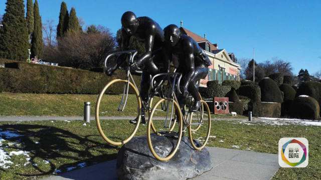 洛桑奧林匹克博物館公園對面湖邊便道上的雕塑。新華社記者高鵬攝