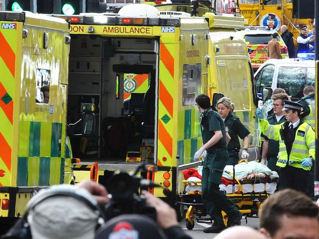 3月22日,倫敦議會(huì)大廈外,救援人員將一名傷者推向救護(hù)車(chē)。(新華/法新)