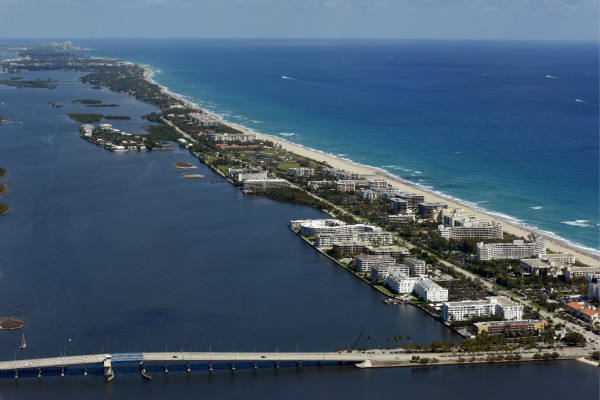這是2017年3月20日航拍的美國佛羅里達(dá)州棕櫚灘的海岸線,海湖莊園就在這個(gè)狹長(zhǎng)的小島上。(新華社記者殷博古攝)