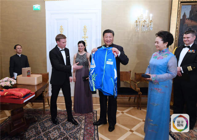 當(dāng)?shù)貢r(shí)間4月5日晚,國(guó)家主席習(xí)近平和芬蘭總統(tǒng)尼尼斯托在赫爾辛基共同會(huì)見(jiàn)剛剛參加完2017年世界花樣滑冰錦標(biāo)賽的中芬兩國(guó)冰雪運(yùn)動(dòng)員代表。習(xí)近平夫人彭麗媛和尼尼斯托夫人豪吉?dú)W參加會(huì)見(jiàn)。這是芬蘭運(yùn)動(dòng)員向習(xí)近平和夫人彭麗媛贈(zèng)送運(yùn)動(dòng)衣。新華社記者饒愛(ài)民攝