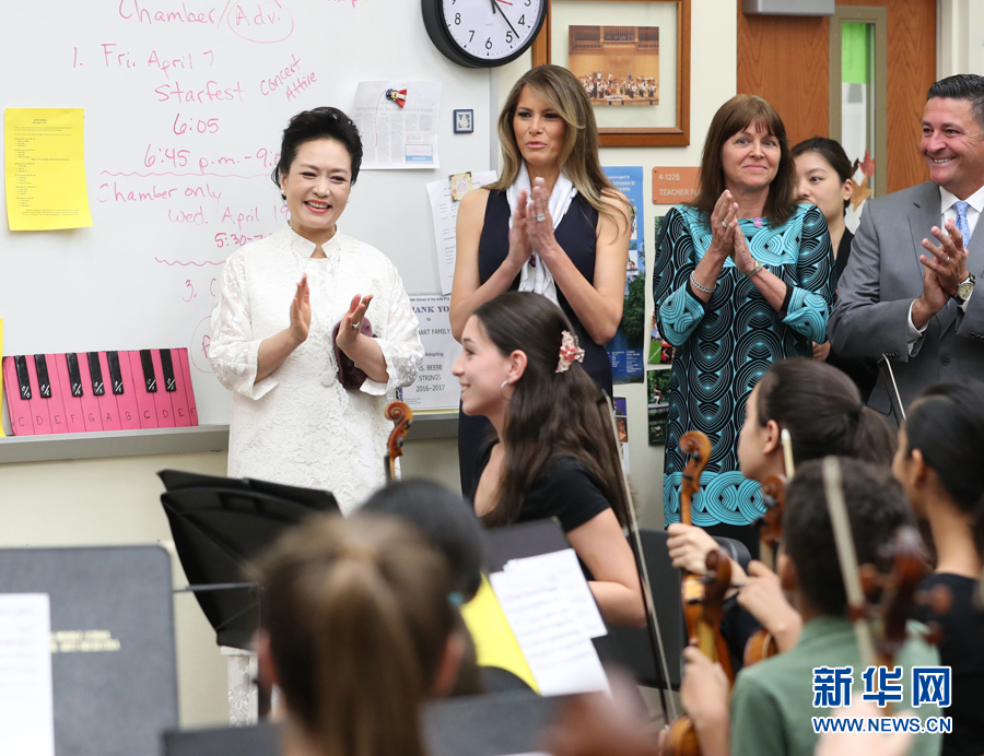 彭麗媛抵達(dá)時(shí),梅拉尼婭和棕櫚灘郡學(xué)區(qū)長(zhǎng)阿沃莎、巴克藝術(shù)中學(xué)校長(zhǎng)羅贊基等在停車處熱情迎接。彭麗媛先后參觀了聲樂(lè)教室、交響樂(lè)隊(duì)教室、弦樂(lè)教室,欣賞學(xué)生演唱和樂(lè)隊(duì)表演,并同學(xué)生們親切互動(dòng)交流。隨后,彭麗媛觀摩了時(shí)政經(jīng)濟(jì)課,回答了學(xué)校小記者關(guān)于“你和藝術(shù)的淵源”的提問(wèn),并接受了學(xué)生自己創(chuàng)作的水彩畫(huà)。彭麗媛表示,中美兩國(guó)可以加強(qiáng)藝術(shù)交流合作。希望巴克藝術(shù)中學(xué)的老師和同學(xué)們以教育和藝術(shù)為橋梁,為增進(jìn)中美兩國(guó)人民友好、推動(dòng)兩國(guó)關(guān)系發(fā)展作出更多貢獻(xiàn)。