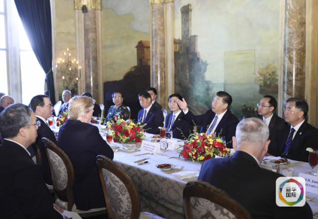 當?shù)貢r間4月7日,國家主席習近平在美國佛羅里達州海湖莊園同美國總統(tǒng)特朗普舉行中美元首第二場正式會晤。這是習近平出席特朗普舉行的工作午宴。(新華社記者蘭紅光攝)
