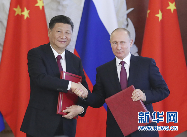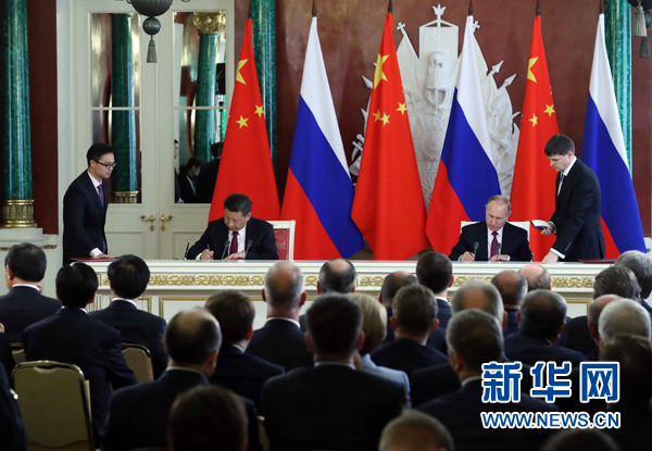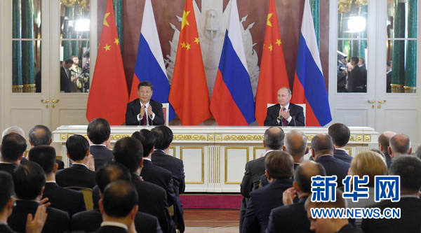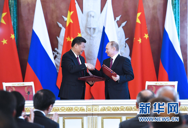 7月4日,國家主席習(xí)近平在莫斯科克里姆林宮同俄羅斯總統(tǒng)普京舉行會(huì)談。會(huì)談后,兩國元首簽署了《中華人民共和國和俄羅斯聯(lián)邦關(guān)于進(jìn)一步深化全面戰(zhàn)略協(xié)作伙伴關(guān)系的聯(lián)合聲明》《中華人民共和國和俄羅斯聯(lián)邦關(guān)于當(dāng)前世界形勢和重大國際問題的聯(lián)合聲明》,批準(zhǔn)了《〈中華人民共和國和俄羅斯聯(lián)邦睦鄰友好合作條約〉實(shí)施綱要(2017年至2020年)》并見證了《中華人民共和國外交部和俄羅斯聯(lián)邦外交部關(guān)于朝鮮半島問題的聯(lián)合聲明》以及經(jīng)貿(mào)、農(nóng)業(yè)、能源、基礎(chǔ)設(shè)施建設(shè)、金融、文化、創(chuàng)新、媒體、信息網(wǎng)絡(luò)、檢驗(yàn)檢疫等領(lǐng)域多項(xiàng)雙邊合作文件的交換。新華社記者 劉衛(wèi)兵 攝