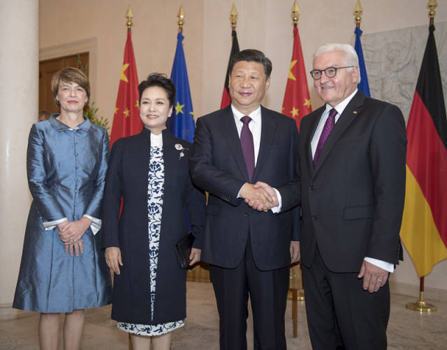 5日上午,德國總統(tǒng)施泰因邁爾在總統(tǒng)府舉行隆重儀式,熱情歡迎習近平主席來訪?!斑^去幾十年,德中關系取得長足進展,各領域友好合作成果豐碩,在國際事務中保持密切協(xié)作。德方愿同中方加強在二十國集團等多邊框架下合作,共同維護國際和平,促進世界發(fā)展?!笔┨┮蜻~爾在會晤中向習主席承諾。