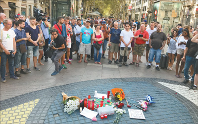 西班牙巴塞羅那恐襲事件后,受害者家屬紛紛在蘭布拉斯大街舉行悼念活動,街上行人自發(fā)停下腳步表示哀悼和慰問。記者 王 迪攝