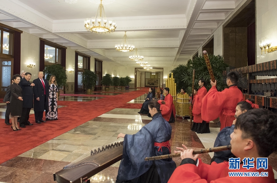 11月9日,國家主席習(xí)近平在北京人民大會堂東門外廣場舉行歡迎儀式,歡迎美利堅合眾國總統(tǒng)唐納德·特朗普對中國進行國事訪問。這是習(xí)近平和夫人彭麗媛同特朗普夫婦在人民大會堂欣賞文藝表演。新華社記者 李學(xué)仁 攝