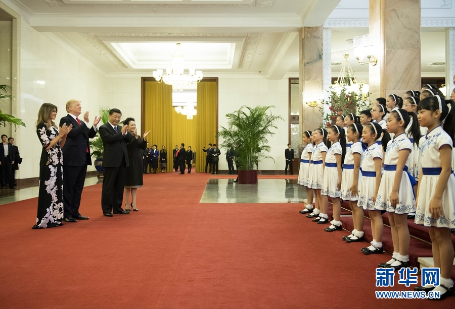 11月9日,國(guó)家主席習(xí)近平在北京人民大會(huì)堂東門外廣場(chǎng)舉行歡迎儀式,歡迎美利堅(jiān)合眾國(guó)總統(tǒng)唐納德·特朗普對(duì)中國(guó)進(jìn)行國(guó)事訪問(wèn)。這是習(xí)近平和夫人彭麗媛同特朗普夫婦在人民大會(huì)堂欣賞文藝表演。新華社記者 李學(xué)仁 攝