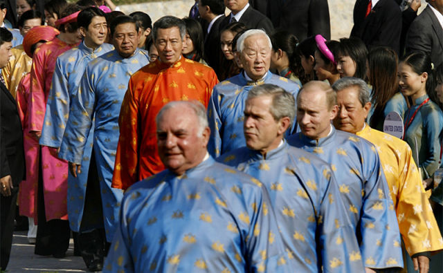 2006年,APEC領導人非正式會議在越南舉辦。當年,各經(jīng)濟體領導人穿的是越南傳統(tǒng)服裝——奧黛。