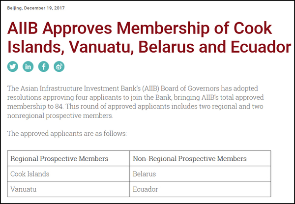【第四次“擴(kuò)容”】2017年12月19日,亞投行宣布批準(zhǔn)庫克群島、瓦努阿圖、白俄羅斯和厄瓜多爾四個成員的加入申請,成員增至84個,這是亞投行自開業(yè)以來的第四次“擴(kuò)容”。圖為亞投行官網(wǎng)截圖。(新華網(wǎng)國際頻道 徐海知)