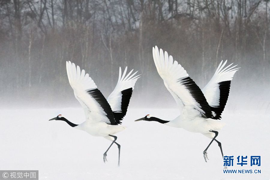12月25日訊(具體拍攝時(shí)間不詳),日本北海道,一對(duì)丹頂鶴在冰面上翩翩起舞,動(dòng)作驚人一致。(圖片來(lái)源:視覺(jué)中國(guó))