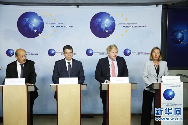 當(dāng)天在與伊朗外長扎里夫舉行會談后,莫蓋里尼、法國外長勒德里安、德國外長加布里爾和英國外交大臣約翰遜舉行發(fā)布會,強(qiáng)調(diào)了歐方的這一立場。