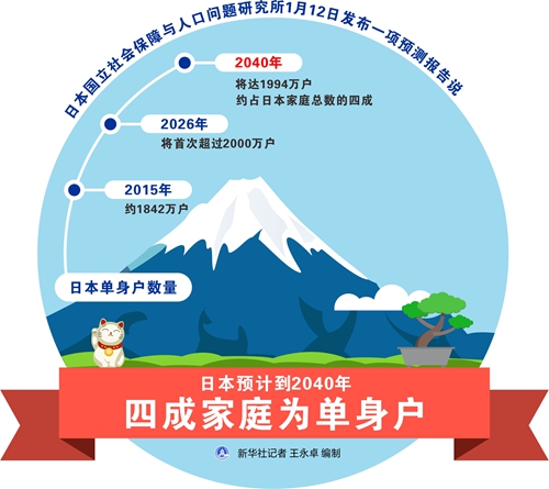 新華社東京1月13日電(記者華義)日本國立社會保障與人口問題研究所12日發(fā)布一項(xiàng)預(yù)測報(bào)告說,到2040年日本單身戶將占日本家庭總數(shù)的約四成。日本老齡化和獨(dú)居現(xiàn)象日益加劇。