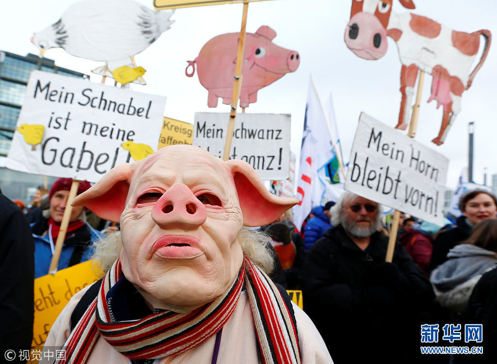 當地時間1月20日,德國柏林,農民們裝扮成家畜游行,抗議柏林國際綠色周舉行,要求更多生態(tài)農業(yè)項目。 (圖片來源:視覺中國)