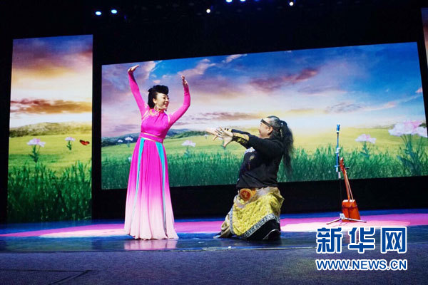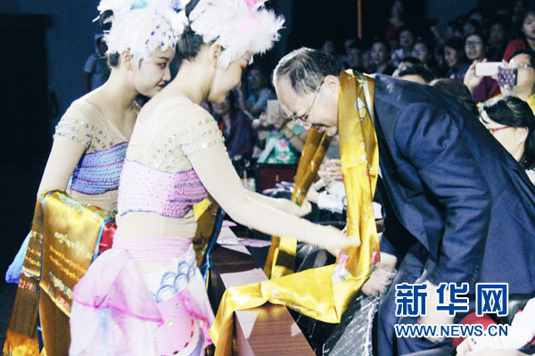 藝術(shù)團演員為現(xiàn)場貴賓敬獻哈達(dá)。