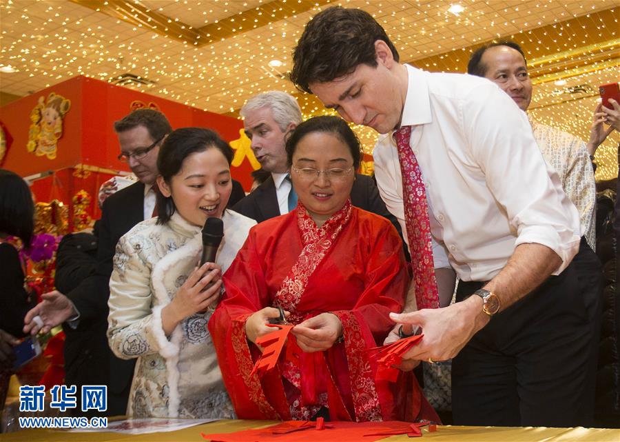 2月15日,在加拿大安大略省米西索加市,總理特魯多(右)向來自中國四川的剪紙藝人學(xué)習(xí)剪紙。加拿大總理特魯多15日來到安大略省米西索加市逛年貨大街,向當(dāng)?shù)厝A人華僑拜年,共慶中國狗年春節(jié)。新華社發(fā)(鄒崢攝)