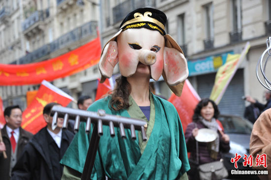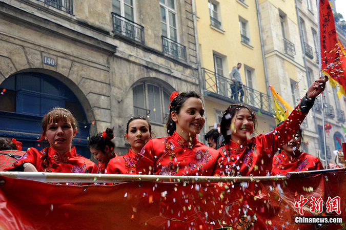 一群法國姑娘穿著唐裝,興高采烈的參加春節(jié)游行,喜感滿滿。