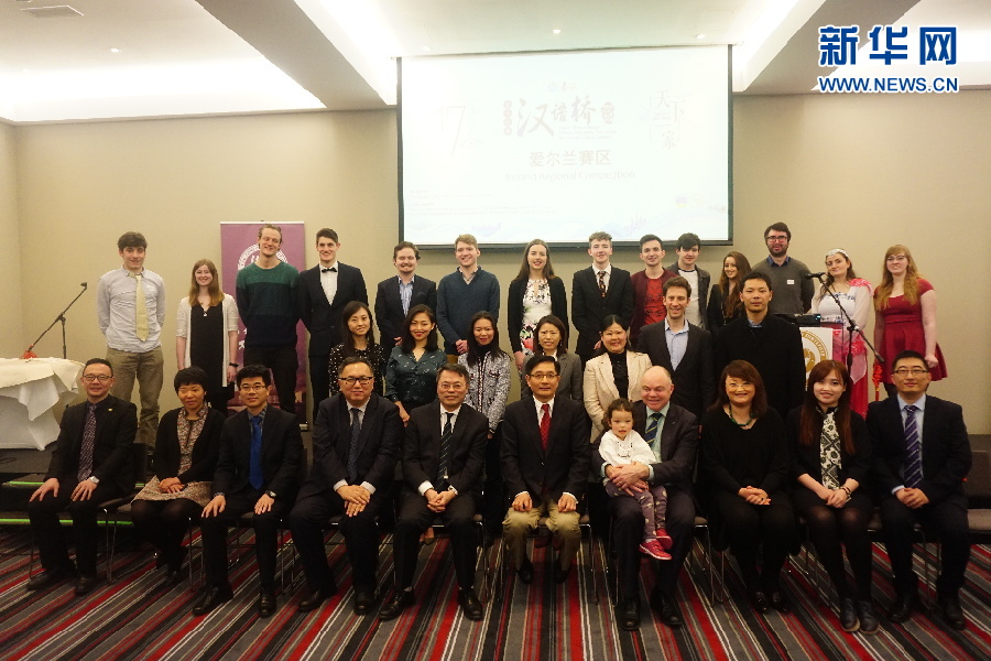 嘉賓和評(píng)委與參賽選手合影。4月7日,第17屆“漢語橋”世界大學(xué)生中文比賽愛爾蘭賽區(qū)選拔賽在首都都柏林舉行。新華網(wǎng)發(fā)